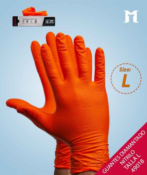 Guante de alta protección, reutilizable, sin polvo. Diamantado y texturizado, proporcionan un nivel de agarre extremo. De uso ambidiestro. Indicado para automoción, industrias químicas, agricultura,gasolineras, talleres, laboratorios, industrias electrónicas, gráficas o mantenimiento industrial,